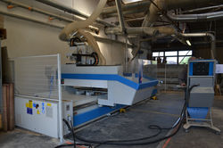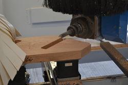 Découpe et façonnage de pièces en bois sur notre centre d'usinage 5 axes Masterwood et sur notre mortaiseuse à commande numérique.