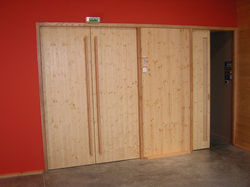 ![]() Agencement en placard et porte coulissante dans une salle des fêtes | ![]() Habillage d'un mur intérieur d'une salle des fêtes en panneaux trois plis épicéa Architecte : Mr Vincent | ![]() Panneaux acoustiques posés dans une salle de gymnastique Architecte : Mme Camara Florence |